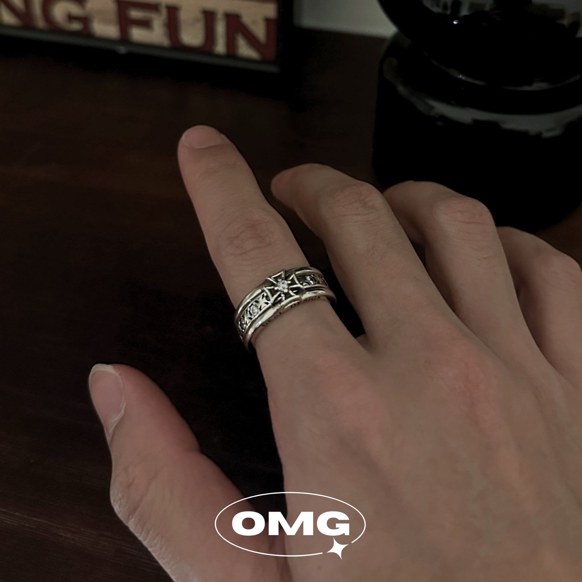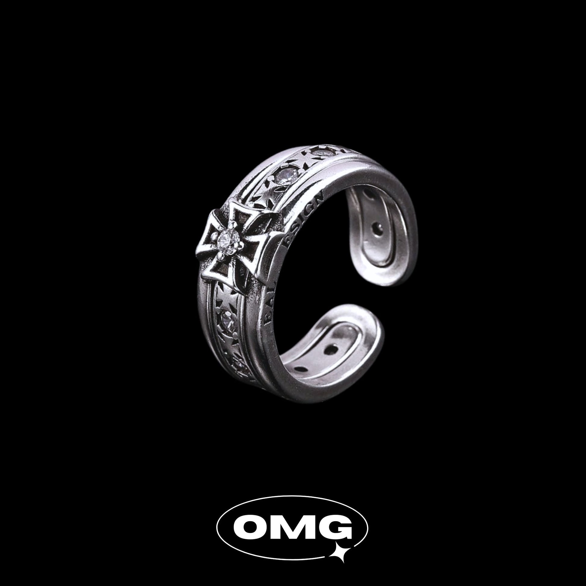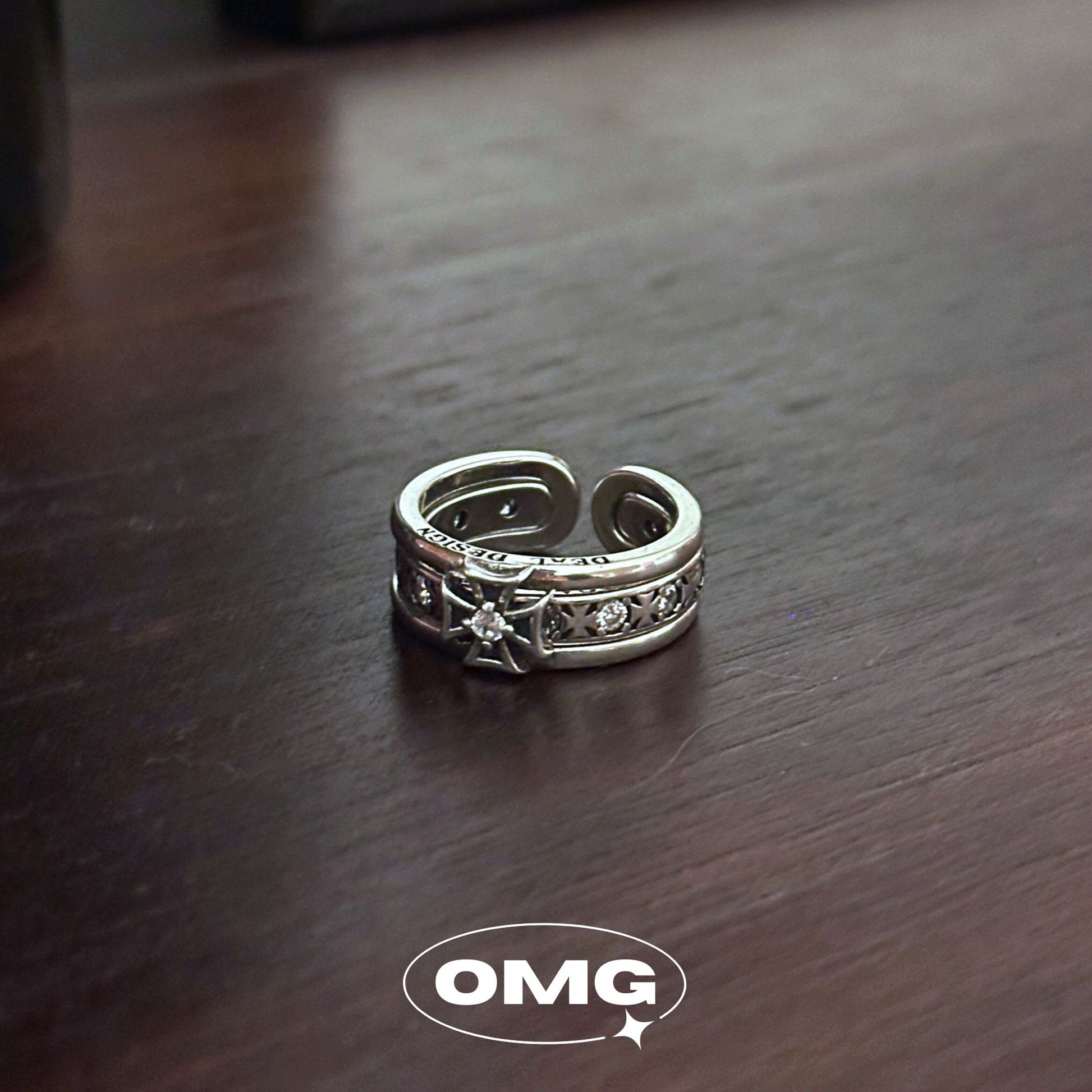 戒指中央鑲嵌閃耀的鋯石及十字架圖案,映照出低調光芒。戒身刻上精細的紋路與多層間紋,展現出復古時尚特性。戒指可分拆成兩隻戒指獨立佩戴,輕鬆戴出疊戴時尚。