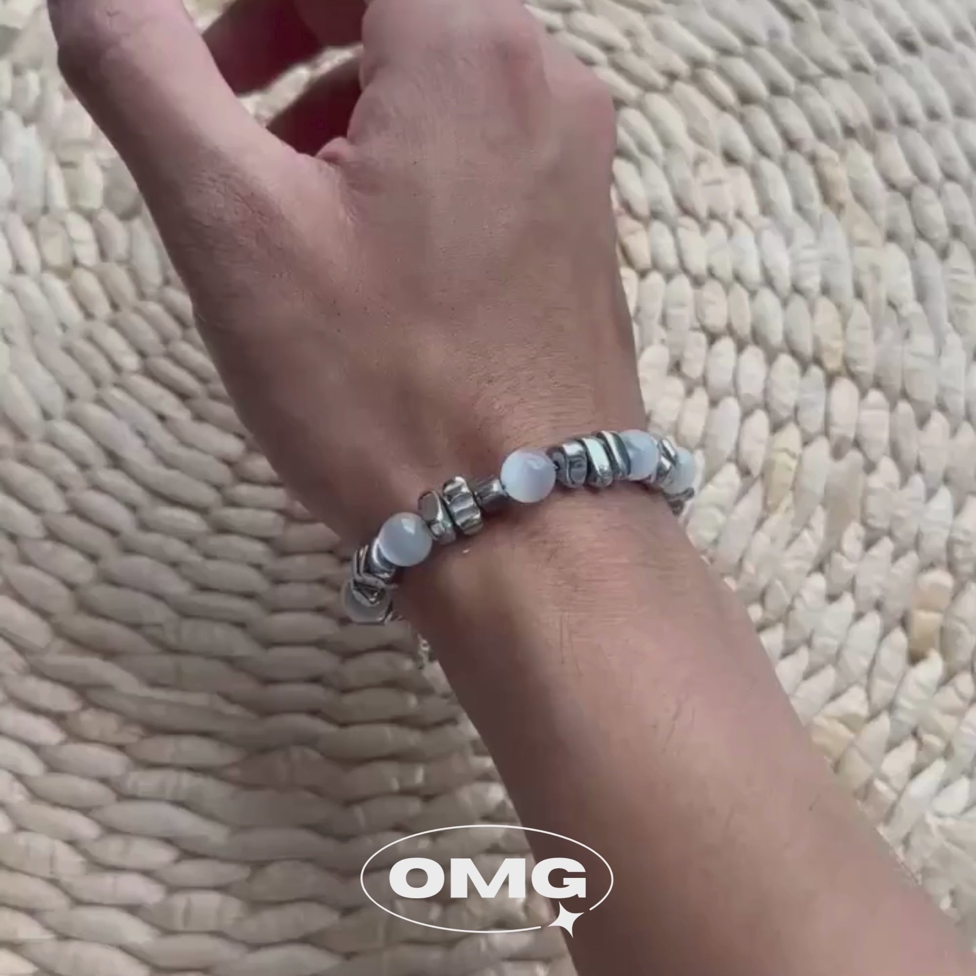 The bracelet features sparkling white cat's eye stones as the main stones, combined with irregularly shaped stones, creating a gentle shimmer effect in the light. Cat's eye gemstone is believed to enhance intuition and insight, as well as boost creativity, helping the wearer better express themselves and tap into their potential.