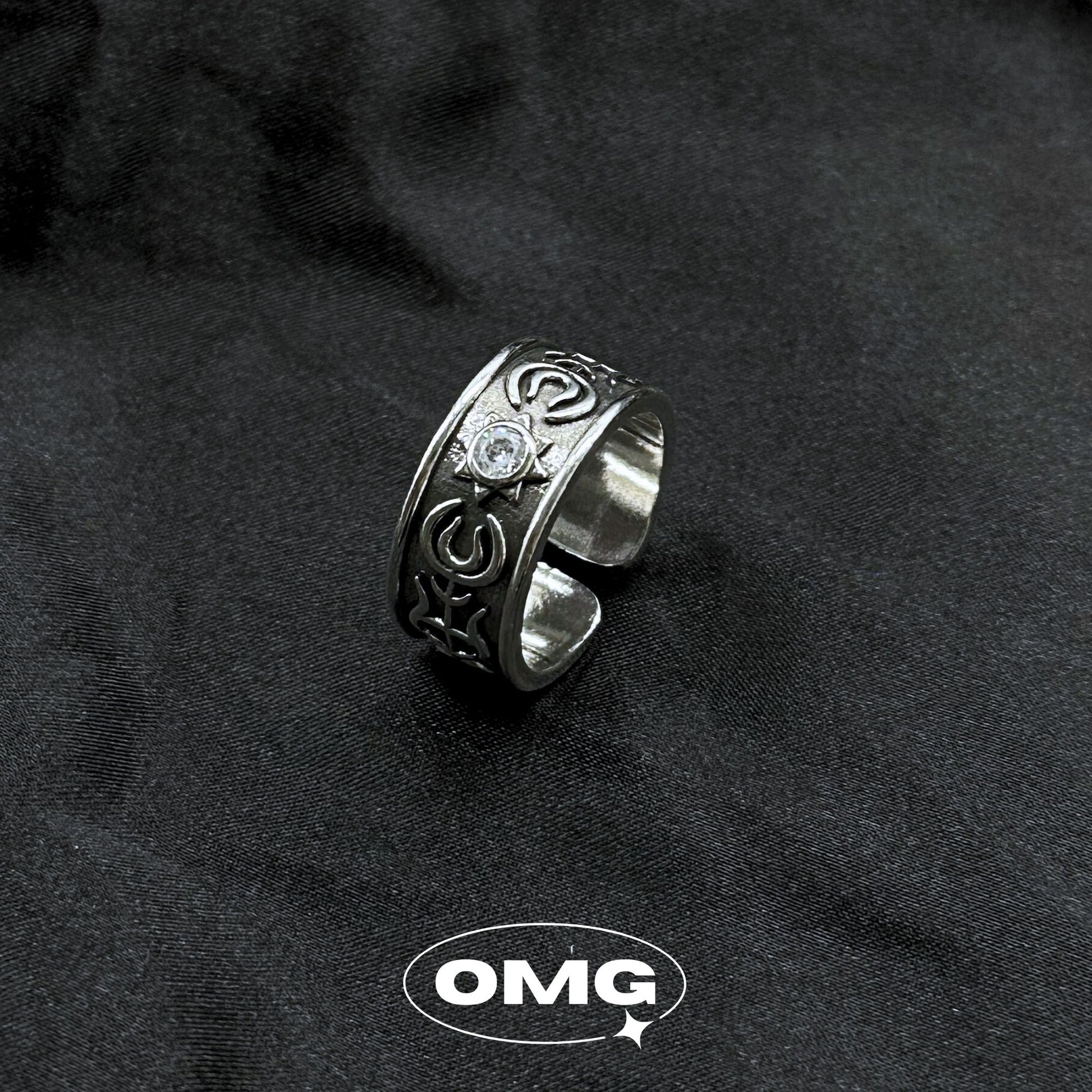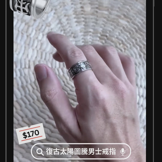 This men ring features intricately carved sun totem and runic symbol patterns, exuding a mysterious and vintage vibe. The center of the sun is set with a sparkling diamond, reflecting light as the ring moves.