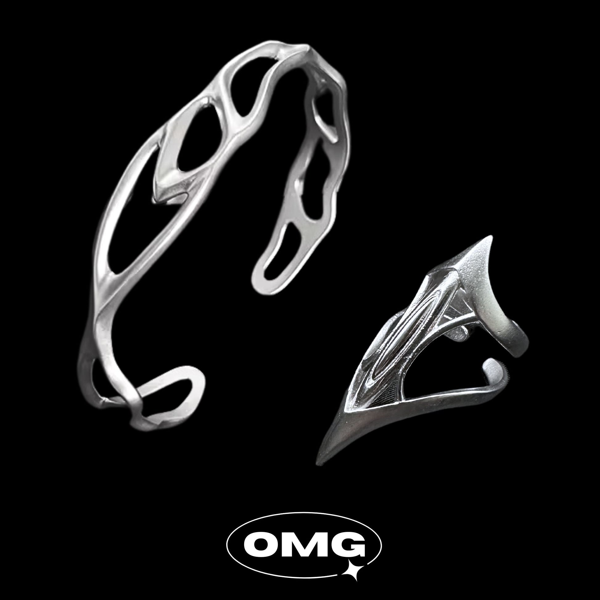 The set includes a "Y2K Odin 925 Silver Ring" and a "Y2K Matte Texture Filigree Bracelet." The main features of the accessories are its unique filigree design and matte texture, adding a delicate and distinctive visual appeal to the overall look. It perfectly aligns with the current Y2K fashion trend.