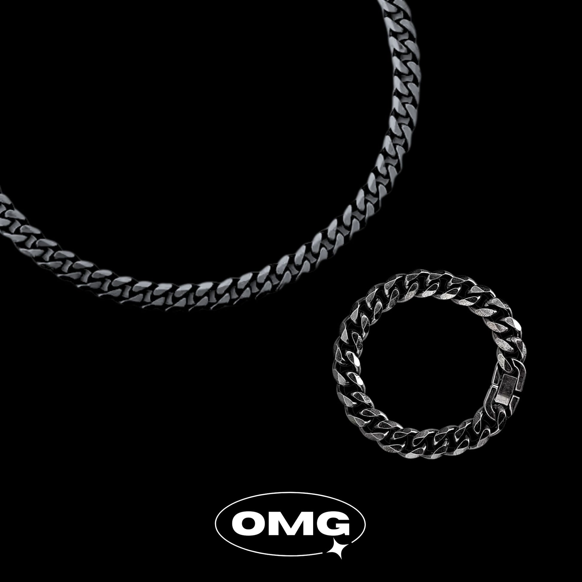 人氣黑古巴鏈飾物套裝款式,鏈粗10mm的復古黑古巴頸鏈配搭復古黑古巴手鏈,打造出型格組合。